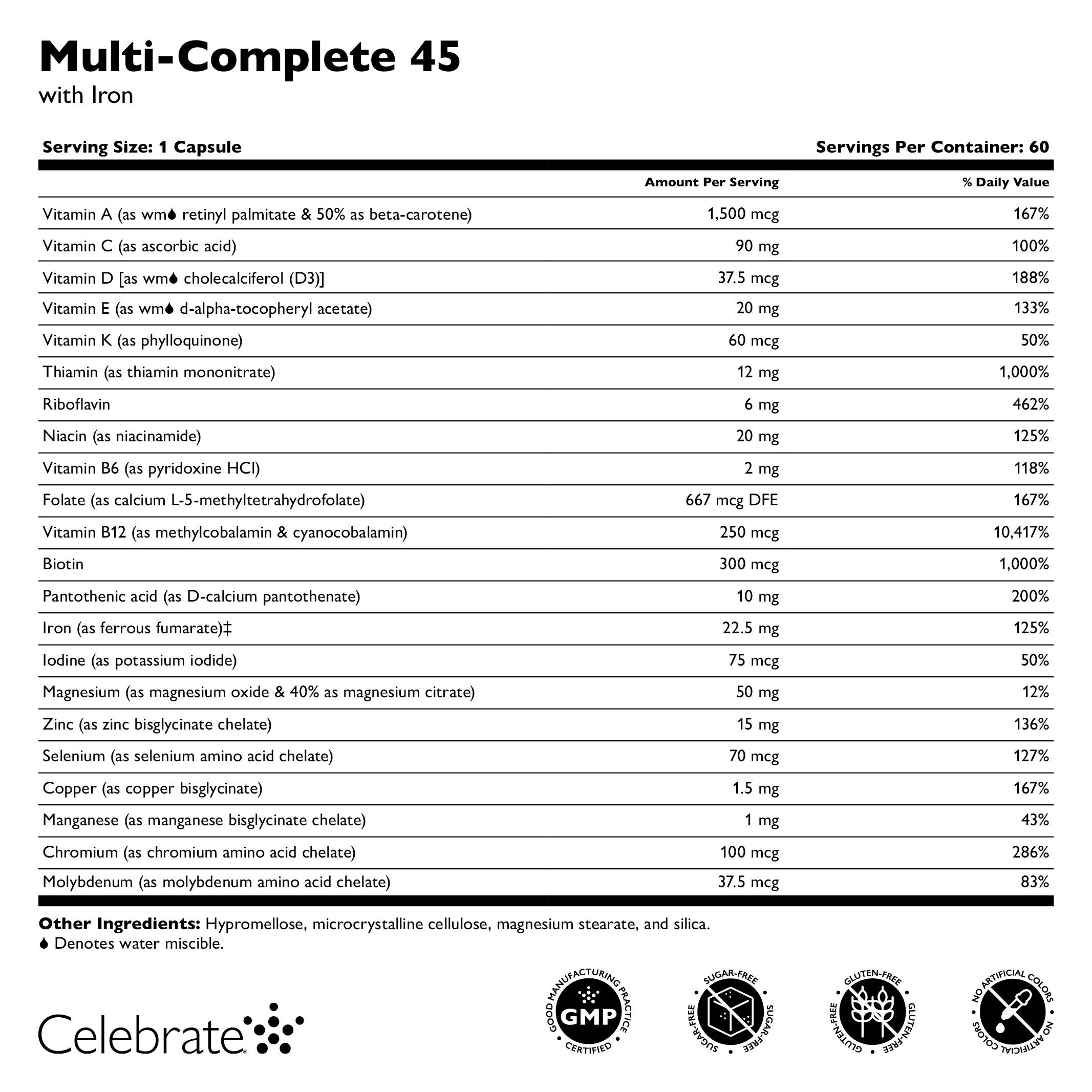 Το Celebrate Multi-Complete 45 περιέχει όλες τις βιταμίνες και τα μέταλλα σε επιλογή δόσης δύο ανά ημέρα, οι ασθενείς απλά χρειάζεται να προσθέσουν ασβέστιο. Αυτή η επιλογή είναι ιδανική για τον ασθενή που είναι ευαίσθητος σε υψηλότερες δόσεις και χρειάζεται να διαχωρίσει τη δόση για καλύτερη ανοχή. Αυτή η πολυβιταμίνη για βαριατρική χειρουργική πληροί τα πρότυπα της ASMBS για πολυβιταμίνη και σίδηρο μετά από βαριατρική χειρουργική. Αυτή η ενσωματωμένη φόρμουλα παρέχει μέγιστη βιοδιαθεσιμότητα καθώς επιλέξαμε προσεκτικά κάθε μορφή βιταμίνης και μετάλλου για να ενισχύσουμε την αλληλεπίδραση και την απορρόφηση. Το MC-45 είναι διαθέσιμο σε δύο γεύσεις μασώμενων (Δάσος Berry και Watermelon) ή σε κάψουλα.